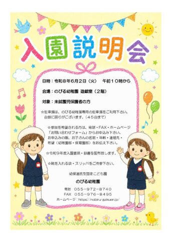 入園説明会ちらし6月2日(火)午前10時から 令和9年度入園説明会を行います。参加をご希望される方は、「お問い合わせフォーム」からぜひお申込み下さい。多くの皆様にお会いできるのを楽しみにしております。