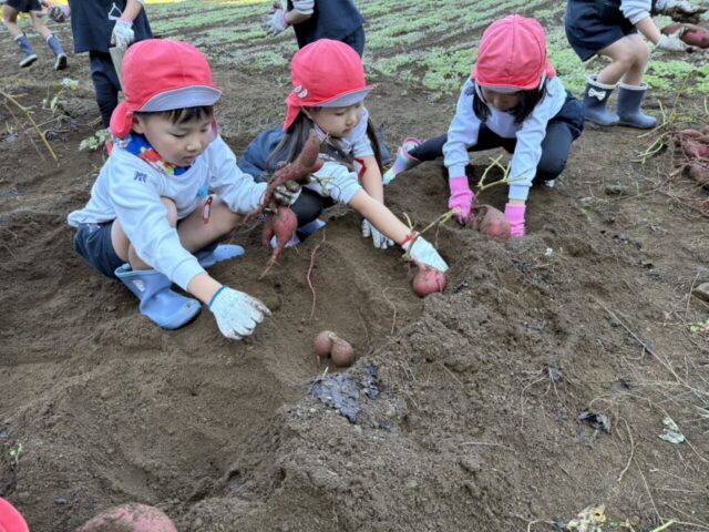 お芋を掘るときは優しく、優しく手で土を掘るんだよ!という